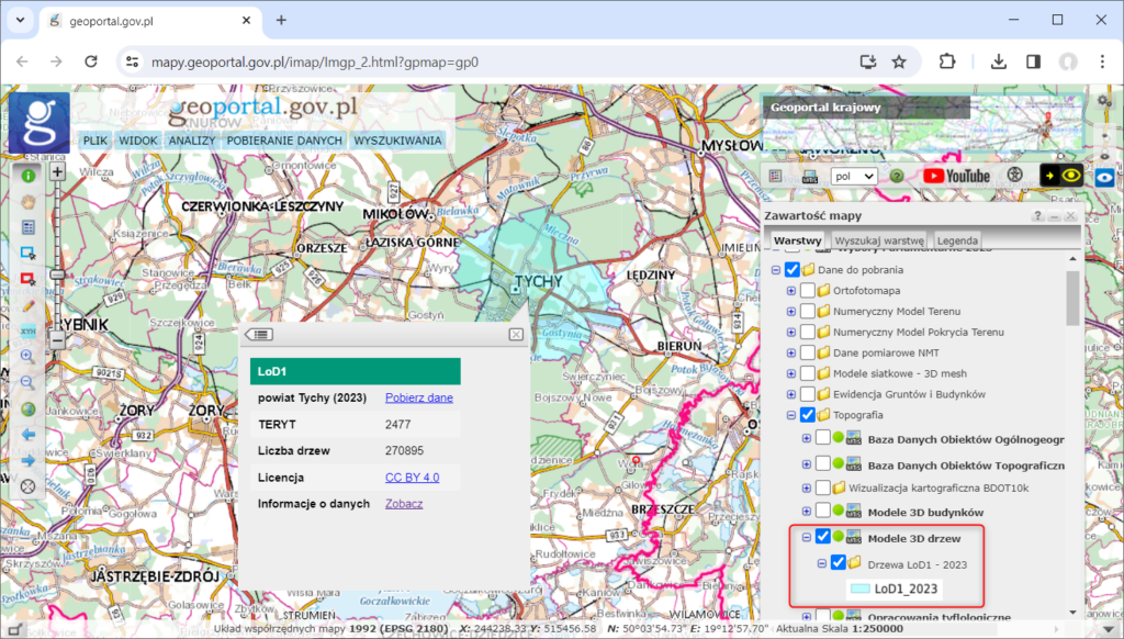 W serwisie www.geoportal.gov.pl dostępne są modele 3D drzew w formacie CityGML dla kolejnych powiatów: