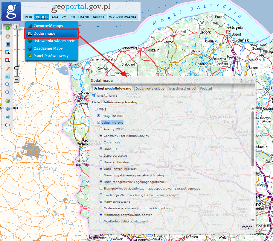 Rozszerzyliśmy katalog zdefiniowanych usług WMS i WMTS. Usługi dostępne w Geoportalu w modułach tematycznych zostały skategoryzowane i udostępnione w panelu Dodawanie usług. Katalog jest dostępny również w Geoportalu Krajowym.