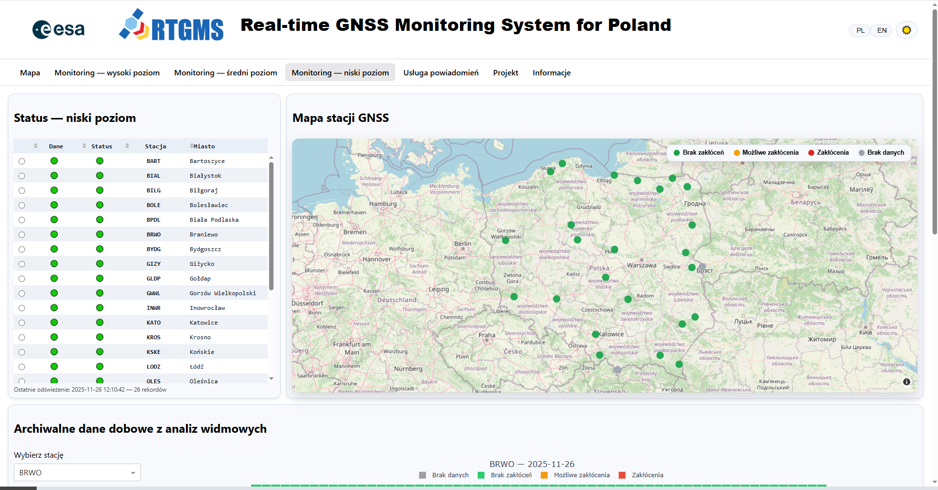 Dla wszystkich zainteresowanych udostępniona została pod adresem https://rtgms.pl strona internetowa, na której przedstawione są wyniki prowadzonego w sposób ciągły monitoringu zakłóceń na wybranych stacjach ASG-EUPOS.