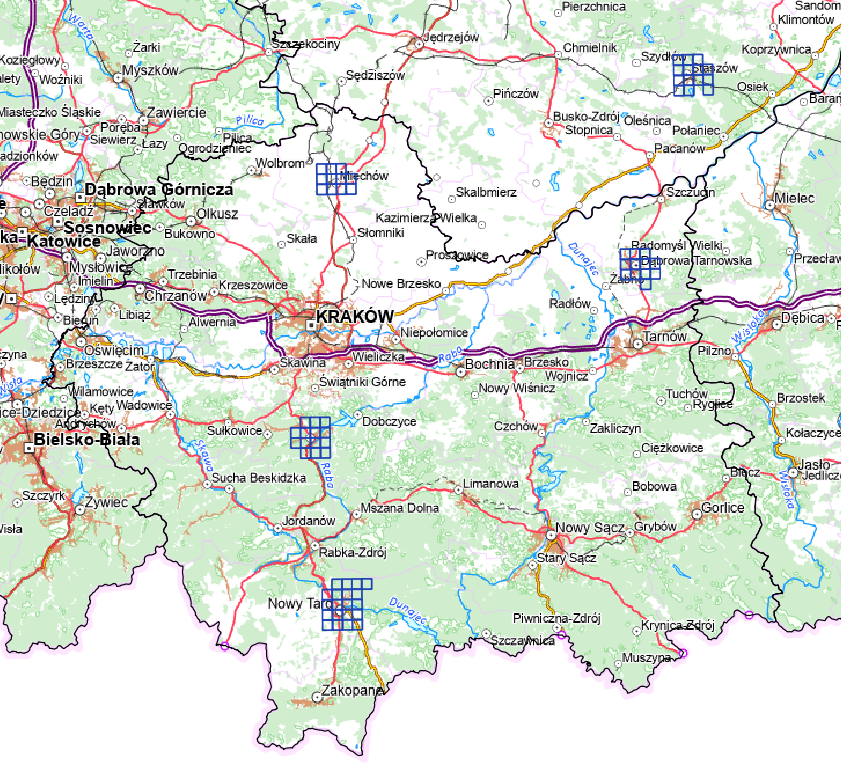 - dla miast: Nowy Targ, Myślenice, Staszów, Miechów, Łęczna, Dąbrowa Tarnowska, Kraśnik, Łuków, Radzyń Podlaski, o powierzchni około 652 km2