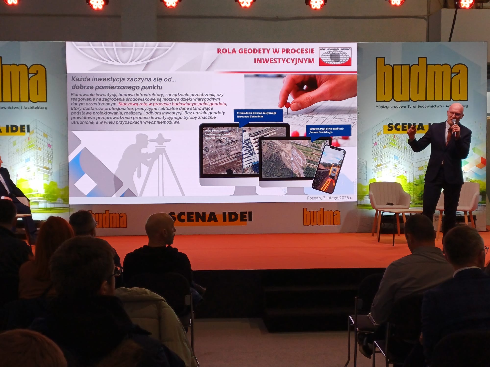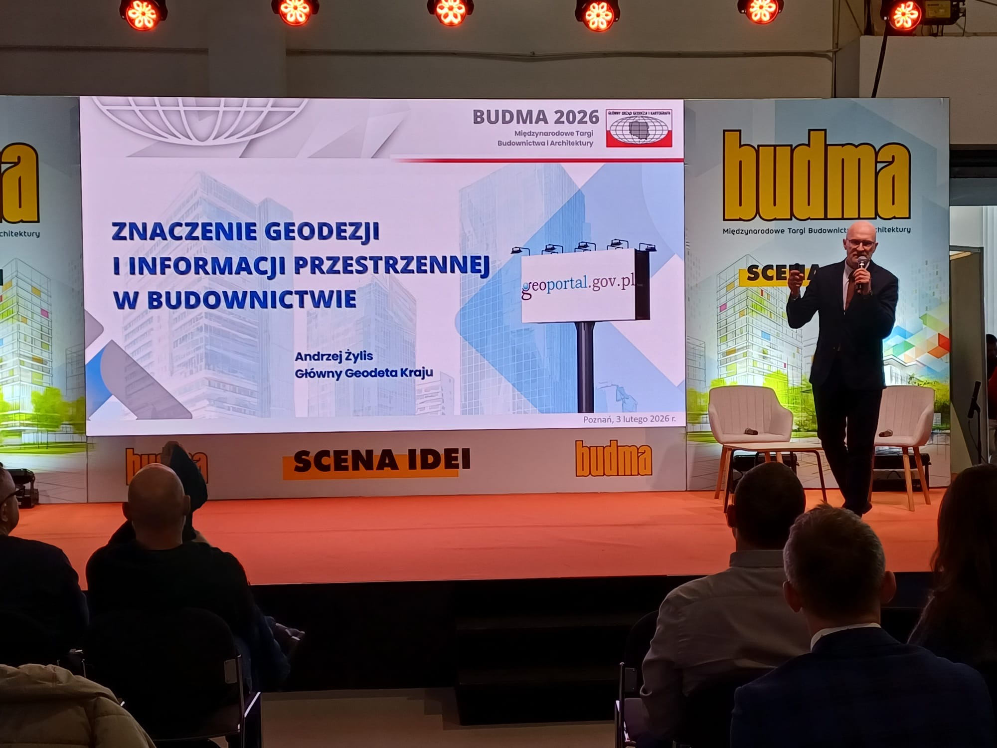 Główny Geodeta Kraju Andrzej Żylis wziął udział w uroczystym otwarciu Międzynarodowych Targów Budownictwa i Architektury BUDMA 2026 w Poznaniu. Przedstawił też w Strefie Idei prezentację o „Znaczeniu geodezji i informacji przestrzennej w budownictwie”.