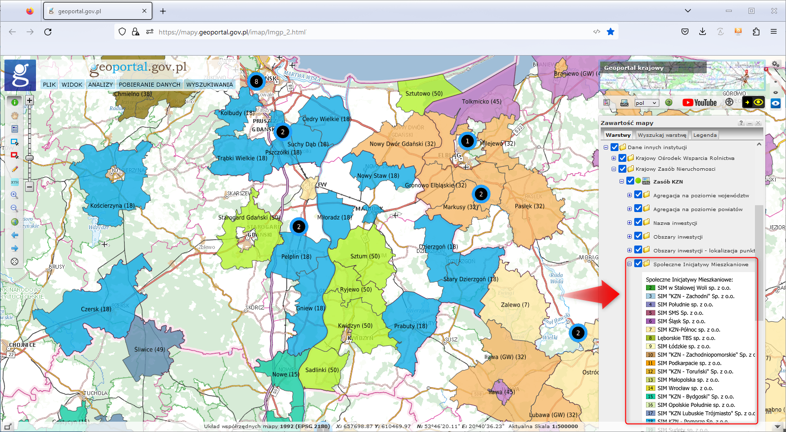W ramach współpracy z Krajowym Zasobem Nieruchomości, na podstawie otrzymanych danych, przygotowaliśmy nową warstwę w usłudze Zasób KZN o nazwie Społeczne Inicjatywy Mieszkaniowe. Warstwa jest dostępna w serwisie www.geoportal.gov.pl, jak przedstawiono na poniższej ilustracji.