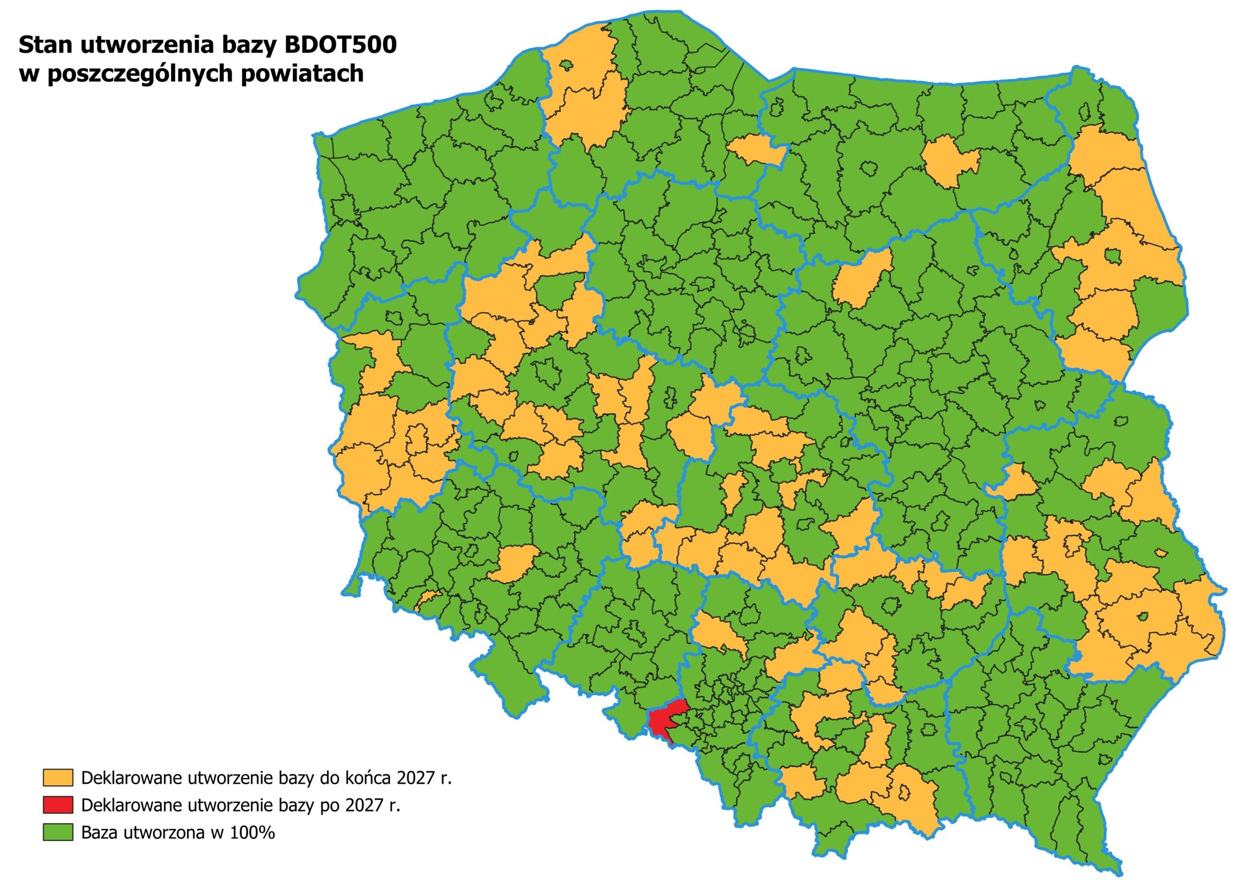 • Baza danych BDOT500 została założona w 305 powiatach.