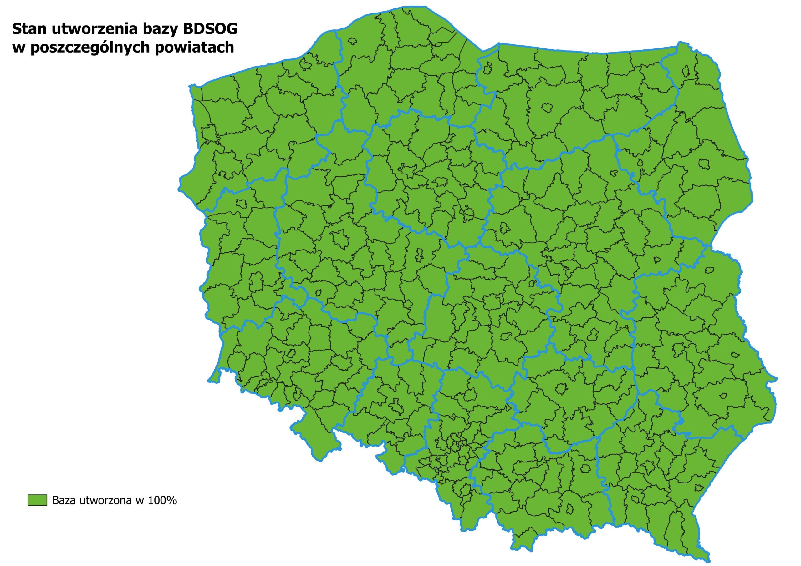 Zgodnie z art. 53b ust. 2 ustawy z dnia 17 maja 1989 r. Prawo geodezyjne i kartograficzne (Pgik) z dniem 31 grudnia 2027 r., upływa termin na utworzenie baz danych, o których mowa w art. 4 ust. 1a pkt 2, 3, 10 i 12 ustawy. W związku z powyższym przyjmując jako zadanie priorytetowe utworzenia wyżej wymienionych baz danych na terenie całego kraju, Główny Geodeta Kraju prowadzi kwartalny, monitoring ich utworzenia. Zgodnie z danymi pozyskanymi za III kwartał 2025 r., pełne utworzenie baz danych wskazuje 281 powiatów. Należy wskazać, że liczba powiatów, które finalizują prace nad utworzeniem poszczególnych baz danych systematycznie wzrasta, co jest wynikiem skutecznych działań podejmowanych zarówno przez Starostów jak i Głównego Geodetę Kraju we współpracy z Wojewódzkimi Inspektorami Nadzoru Geodezyjnego i Kartograficznego.