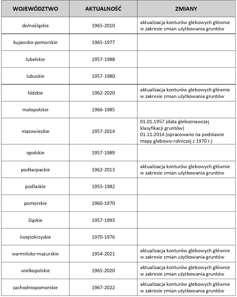 Aktualność danych wektorowych GML konturów i odkrywek glebowych w podziale na województwa