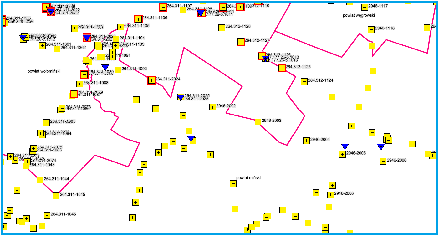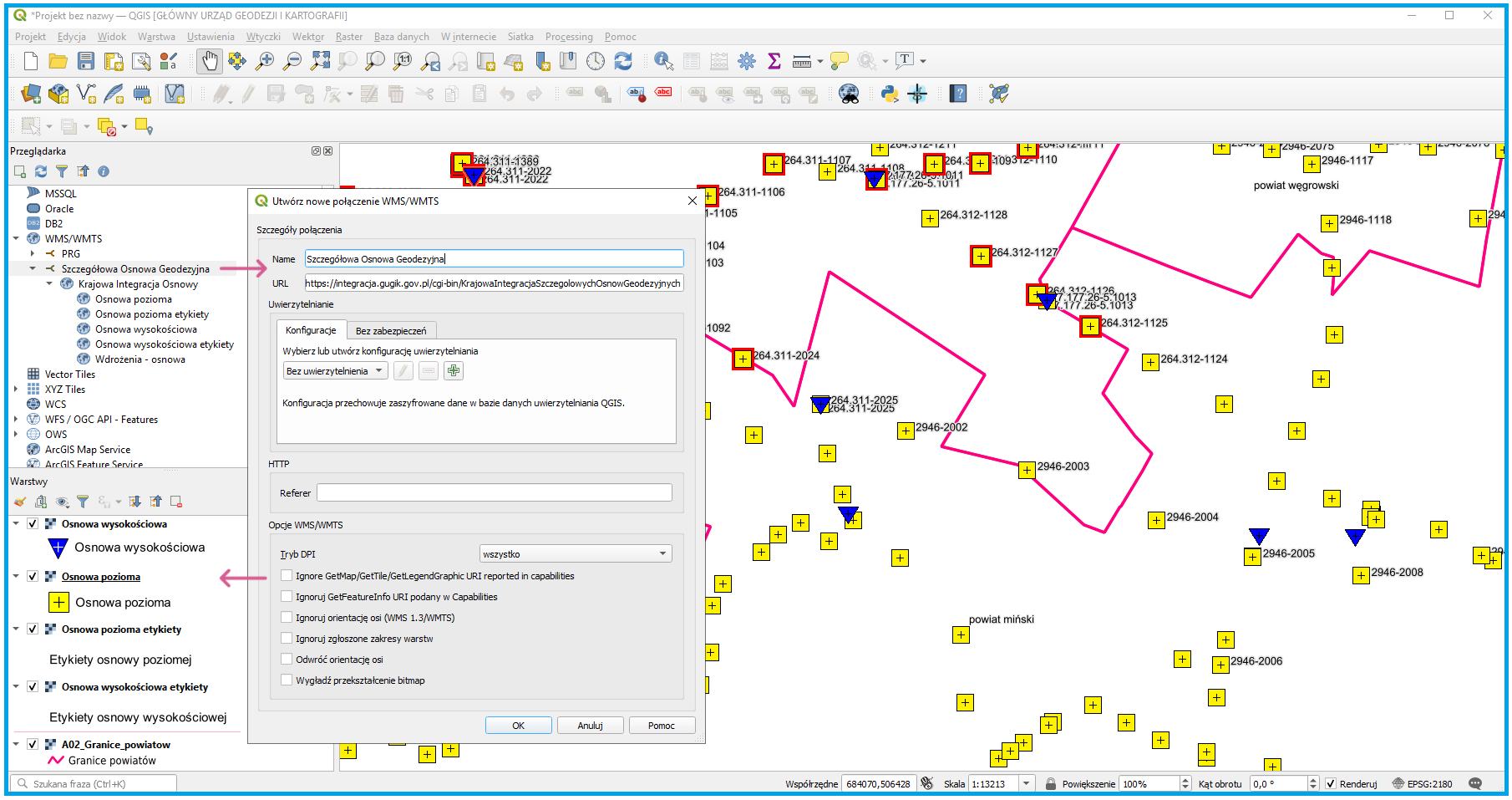 Usługę możemy także podłączyć w dowolnym oprogramowaniu, które posiada funkcję klienta WMS (adres: https://integracja.gugik.gov.pl/cgi-bin/KrajowaIntegracjaSzczegolowychOsnowGeodezyjnych), a efekty działania usługi podłączonej w QGIS przedstawiono na rys. 4.